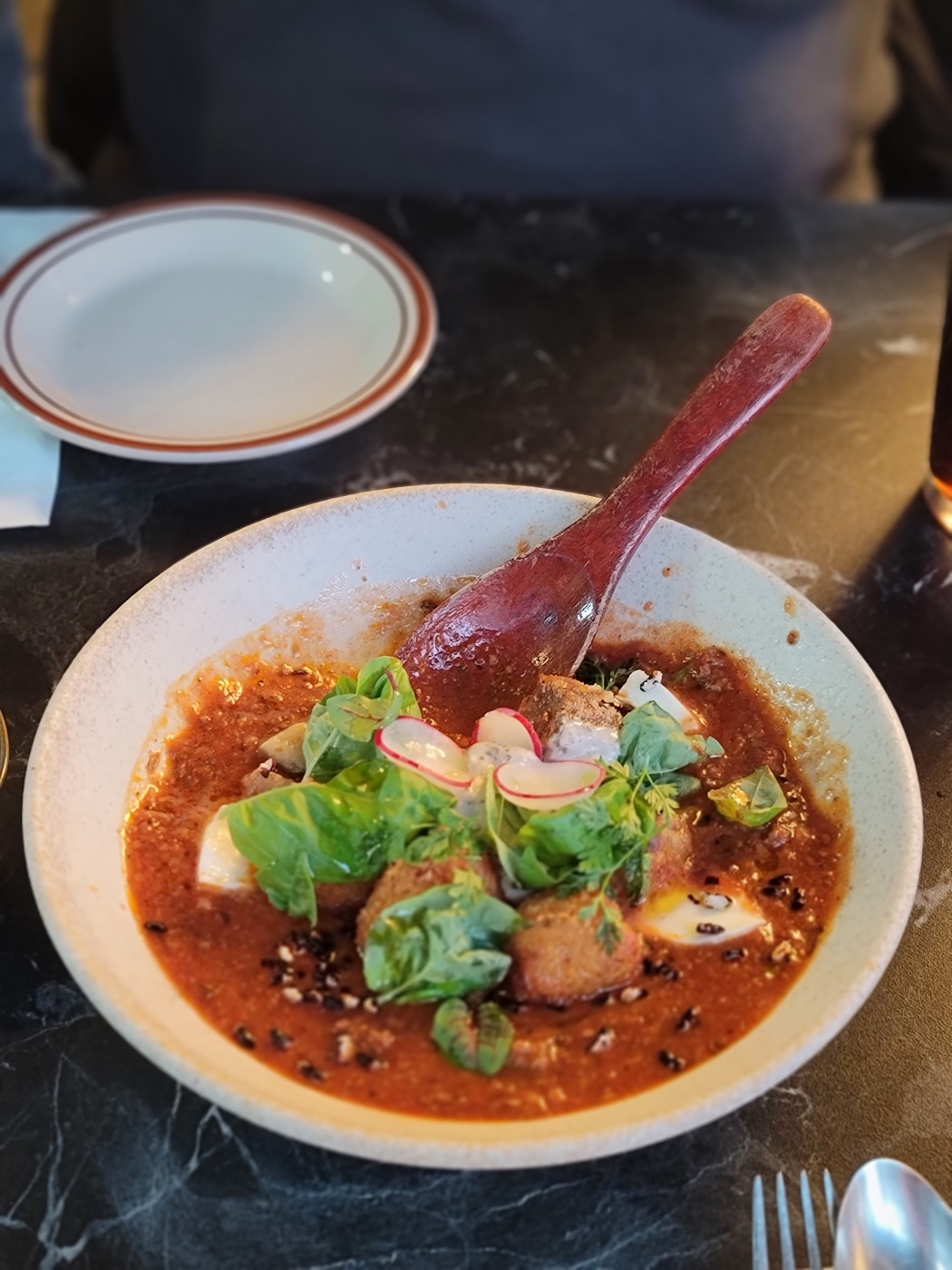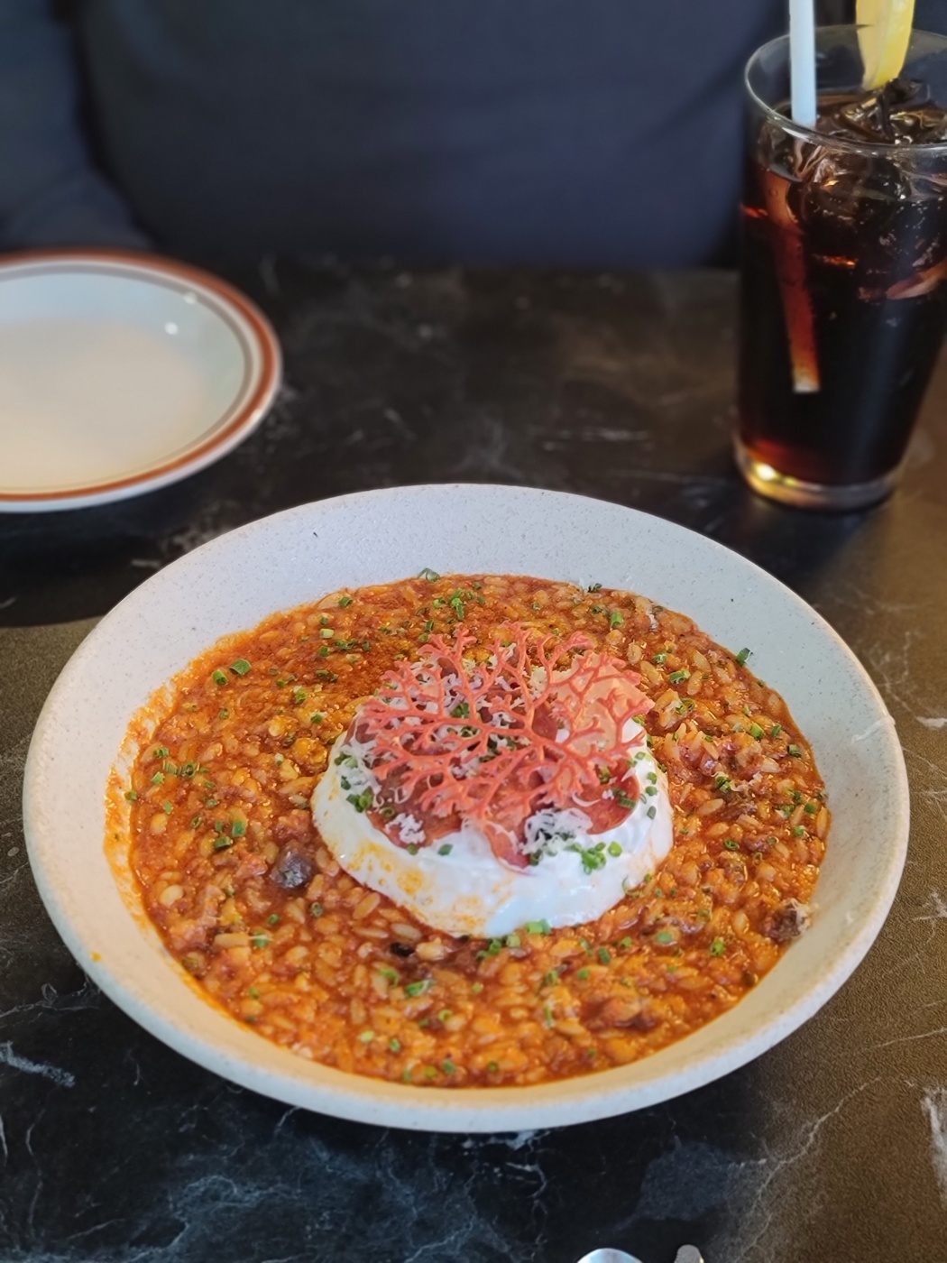 쵸리조와 페페로니 특유의 향과 감칠맛 그리고 한우사골육수의 진하고 고소한 향이 그대로 표현되는 리조또라고 한다.
