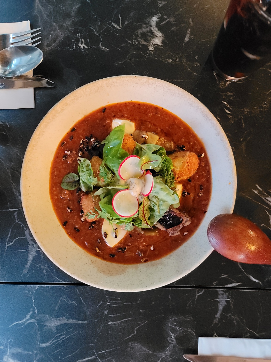 쵸리조, 페퍼로니, 베이컨, 홈메이드 파스트라미, 한우사골크림, 토마토퓨레, 리소파스타, 보리, 차이브가 들어가 있다.