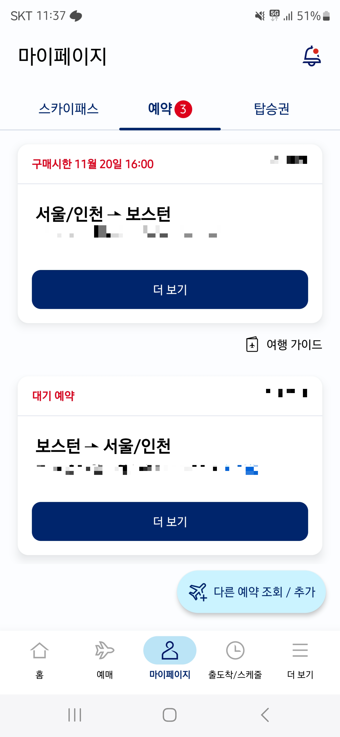 2. 돌아오는 항공편(보스턴to인천) 비행시간이 더 길어서 약 두 달 전에 대기예약을 걸었다.