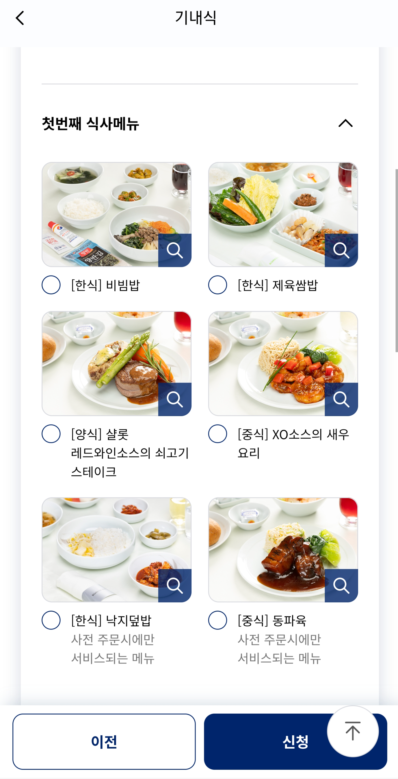 ㅇ프레스티지석 기내식 사전 주문 서비스